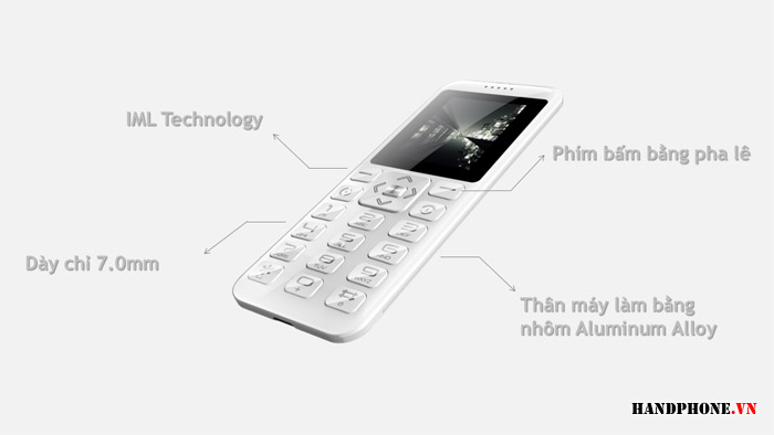 Thiết kế kiểu dáng thời trang nhỏ gọn, màu sắc trẻ trung, máy siêu mỏng chỉ 7 mm nhắm vào lớp khách hàng trẻ trung, cá tính. Lưng máy được thiết kế với chất liệu hợp kim nhôm sang trọng. Các góc bo tròn đều tạo cảm giá máy càng mỏng hơn với chiều dày thực tế của máy. Phím bấm nhẹ, dễ bấm được làm bằng chất liệu pha lê trong suốt. Máy chỉ hỗ trợ 1 sim, đầy đủ các chức năng cơ bản như: camera chụp hình, quay video, ghi âm cuộc gọi tự động, Nghe nhạc mp3, Radio FM  ... Hàng được phân phối chính hãng và bảo hành toàn quốc 1 năm với giá bán xấp xỉ 300.000đ