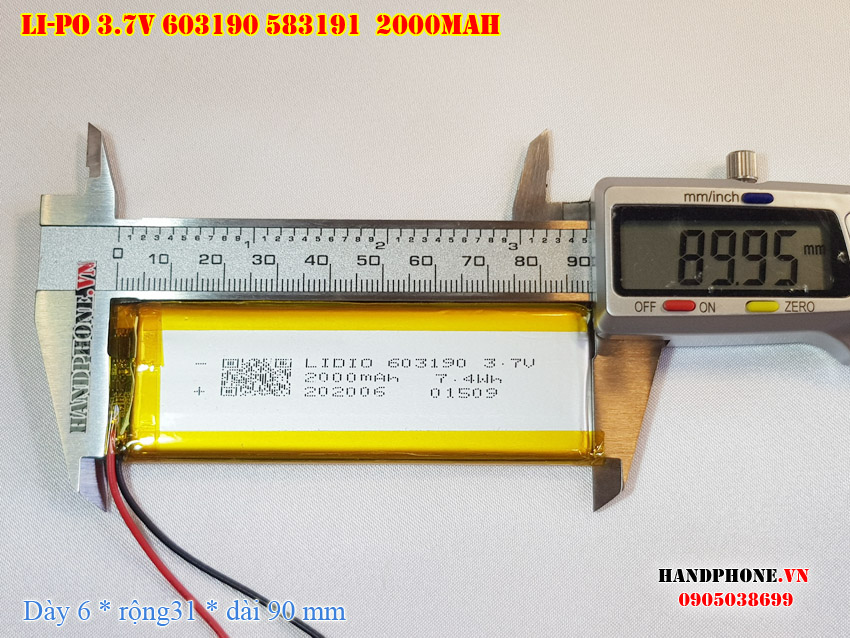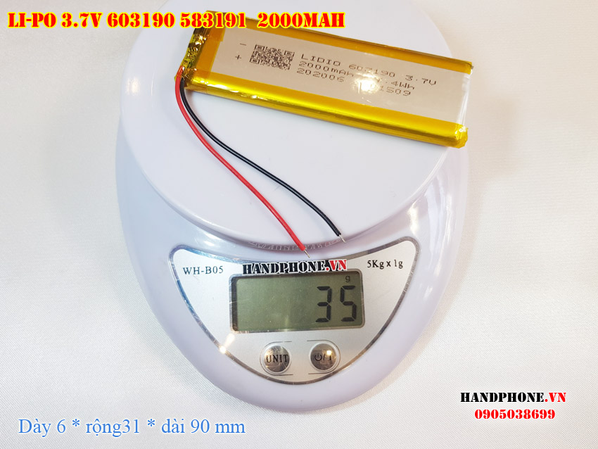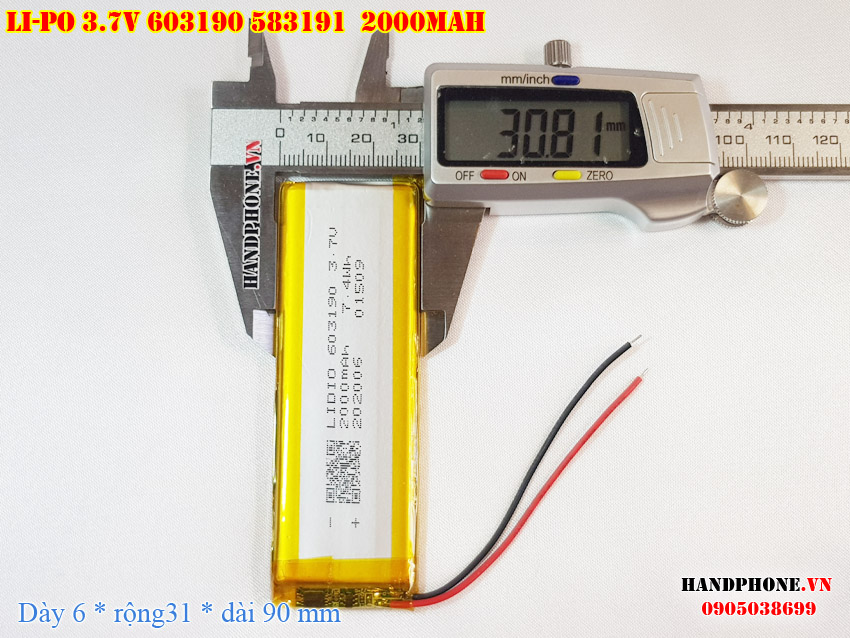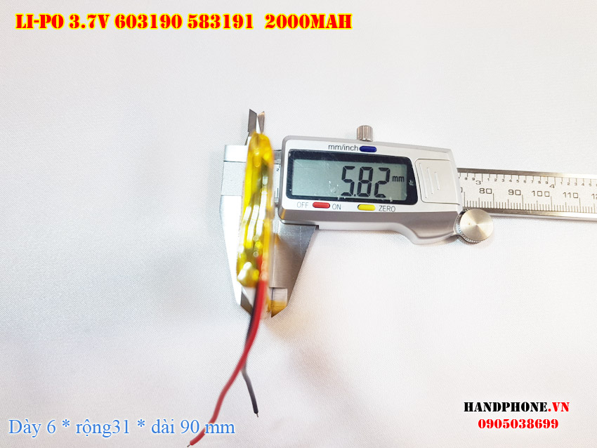 Ảnh chụp thật thực tế đo thông số sản phẩm pin Li-Po 2000mAh 603190 583191 tại Handphone.vn