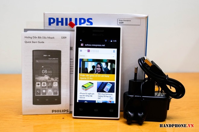 Philips S309 được bán kèm sách hướng dẫn, sạc, cáp kết nối và tai nghe.